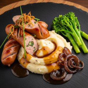 A5: Elevate the classic comfort by serving the chicken sausage Bangers and Mash on a rustic wooden board with a side of seasonal roasted vegetables or wilted greens. A drizzle of truffle oil over the mash or a sprinkle of crispy shallots on top can add sophistication. Pair with a crisp white wine or a light, fruity beer to complement the meal’s flavors.