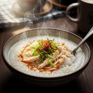 A: Chicken rice porridge, also known as ”chicken congee,” is a humble yet nourishing dish made by slow-cooking rice in ample water or broth until it transforms into a velvety, creamy porridge. Tender pieces of chicken are added for flavor and protein, creating a warm, soothing bowl that feels like a culinary hug on cold or weary days.